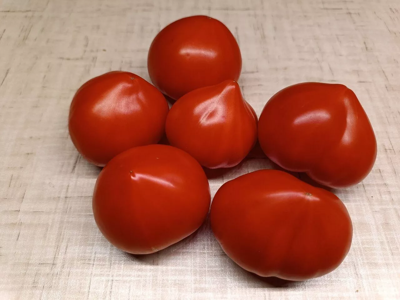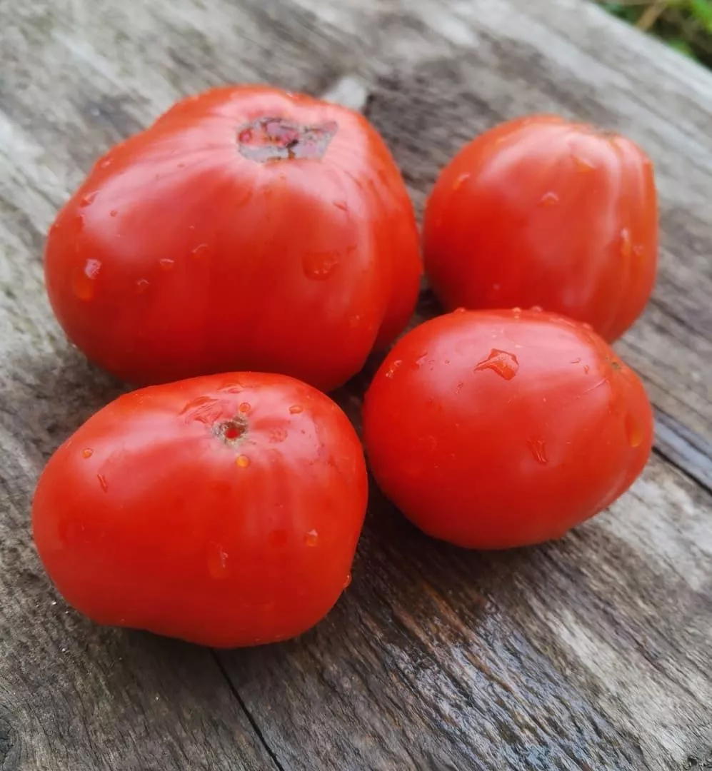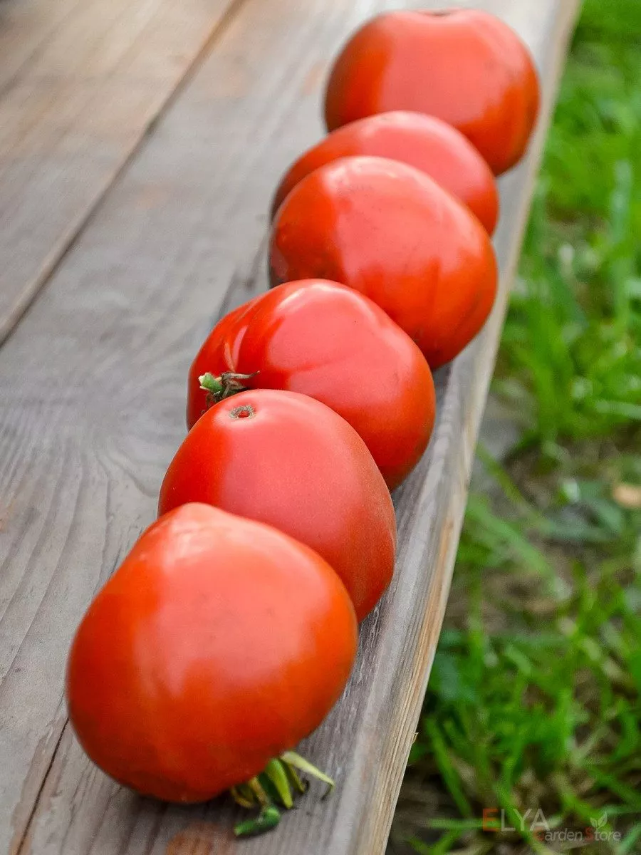 Окраска в биологической спелости — равномерный, глубокий красно-алый цвет без зеленого пятна у плодоножки и без посторонних оттенков (оранжевого или розового). Масса плодов варьируется в широком диапазоне от 120 до 250 граммов. На практике нижние, первые кисти всегда формируют наиболее крупные экземпляры, а плоды на верхних ярусах могут быть мельче.