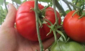 Плоды имеют узнаваемую сердцевидную форму с выраженной ребристостью в области плодоножки. Это не случайный дефект, а стабильный сортовой признак, который усиливается у самых крупных томатов. Окраска зрелого плода — равномерный малиновый цвет без зеленого пятна у плодоножки.