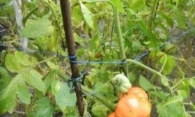 - Подвязывайте стебель к опоре мягкой лентой по мере роста. Особое внимание — тяжелым кистям. Их нужно подвязывать отдельно или использовать сетки-поддержки, иначе плодоножки могут обломиться под весом плодов массой до 900 граммов.