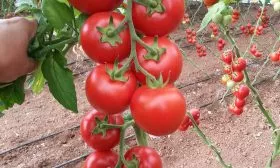 Внешний вид налитых кистей настолько декоративен, что этот сорт часто выращивают не только для еды, но и для украшения теплицы. Плодоношение растянутое, благодаря индетерминантному типу роста новые кисти продолжают закладываться до конца вегетационного периода.