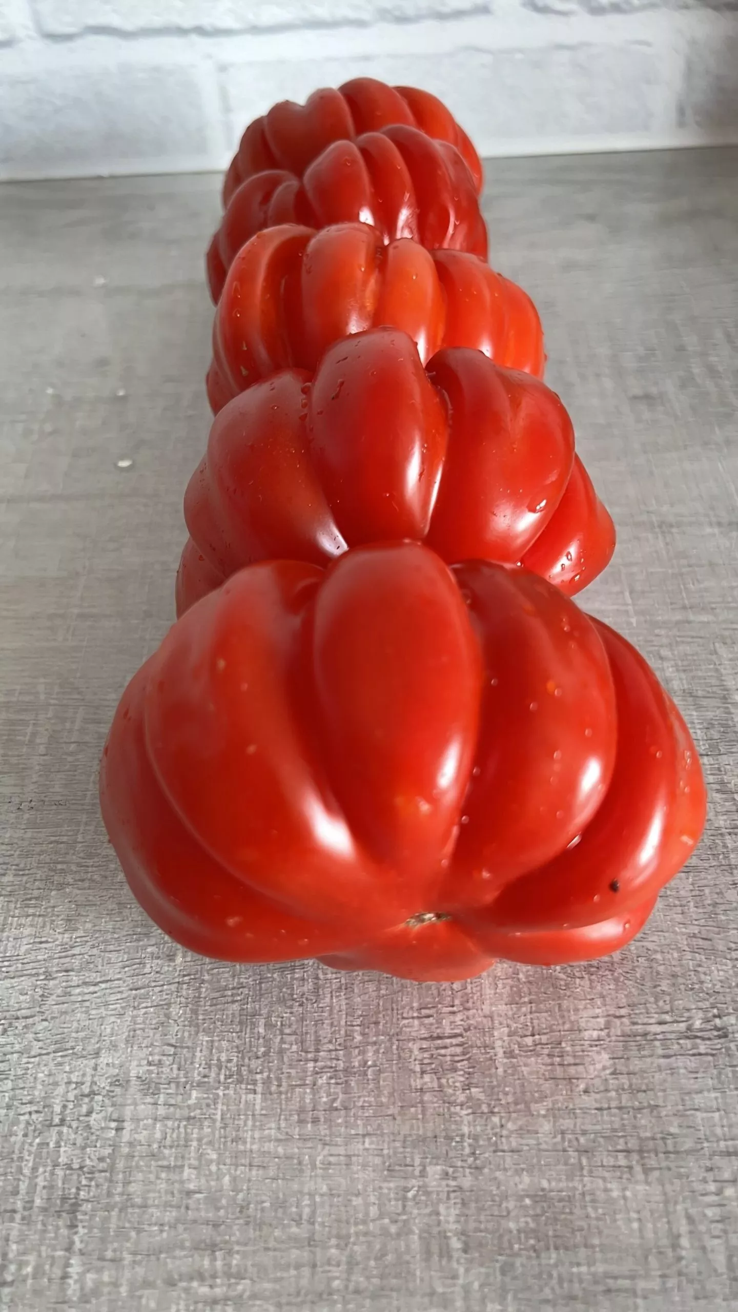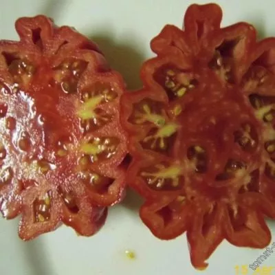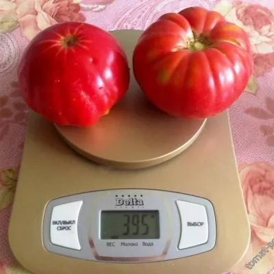 Плоды относятся к категории крупных, их средняя масса соответствует заявленным 400 граммам. При нормировании завязей и оптимальном уходе отдельные экземпляры могут наливаться и сильнее. Полностью созревшие томаты приобретают равномерный, насыщенный красный цвет без зеленого пятна у плодоножки.