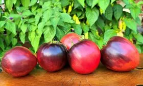 - Для свежего потребления. В салатах и нарезке сорт также проявляет себя достойно. Его красно-оранжевые плоды с необычным фиолетовым «загаром» вносят цветовой акцент, а вкус с выраженной сладостью разнообразит летнее меню. Спелые помидоры обладают хорошей лежкостью и могут храниться в прохладном месте несколько недель без потери товарных качеств.