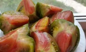 Мякоть соответствует бифштексному типу: многокамерная, очень мясистая и сочная, но при этом не водянистая. Семян внутри немного. На разрезе часто видна интересная мраморность — переливы и вкрапления более темных и светлых оттенков красного и розового.