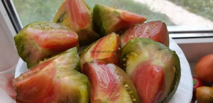 Мякоть соответствует бифштексному типу: многокамерная, очень мясистая и сочная, но при этом не водянистая. Семян внутри немного. На разрезе часто видна интересная мраморность — переливы и вкрапления более темных и светлых оттенков красного и розового.