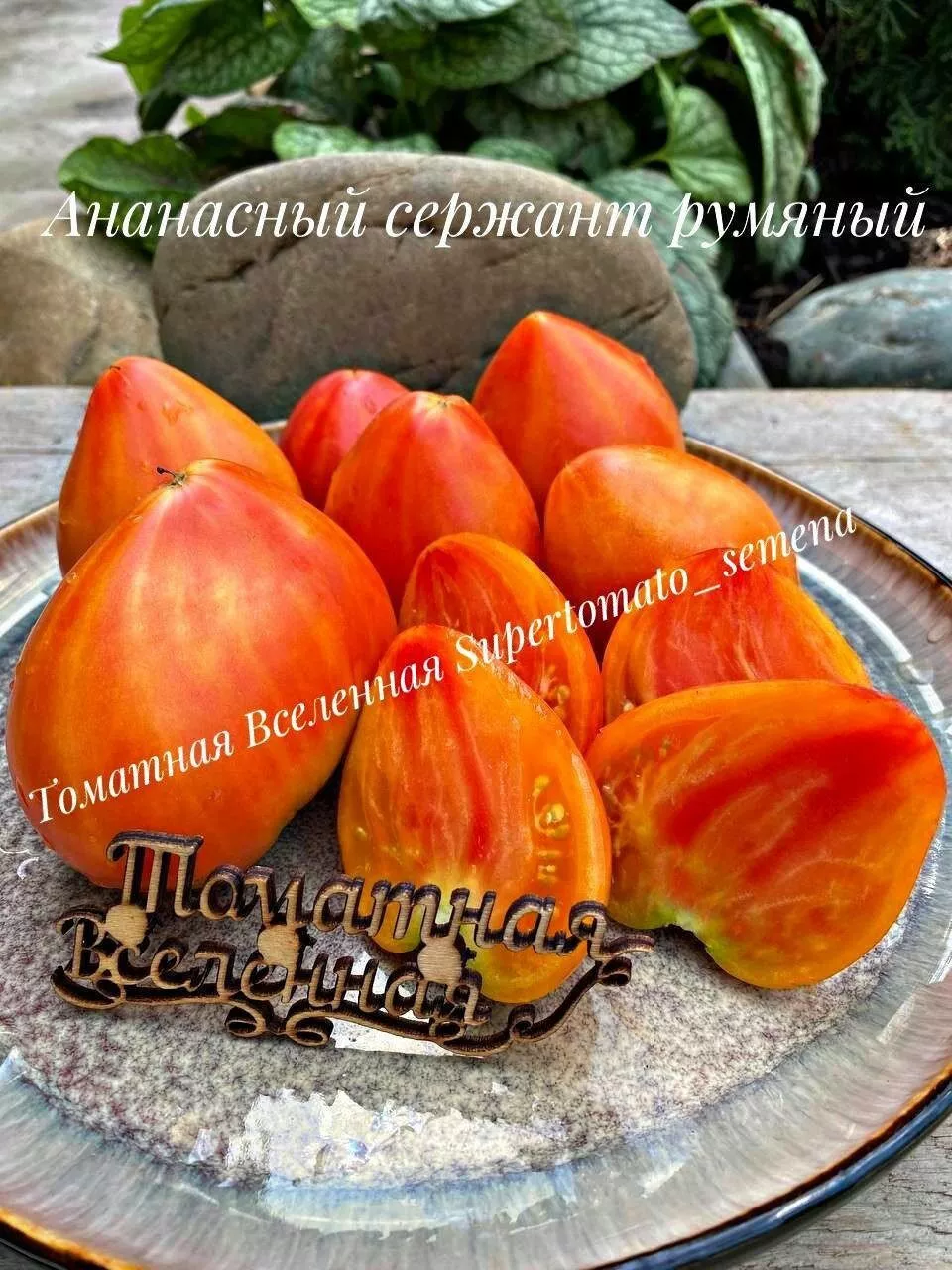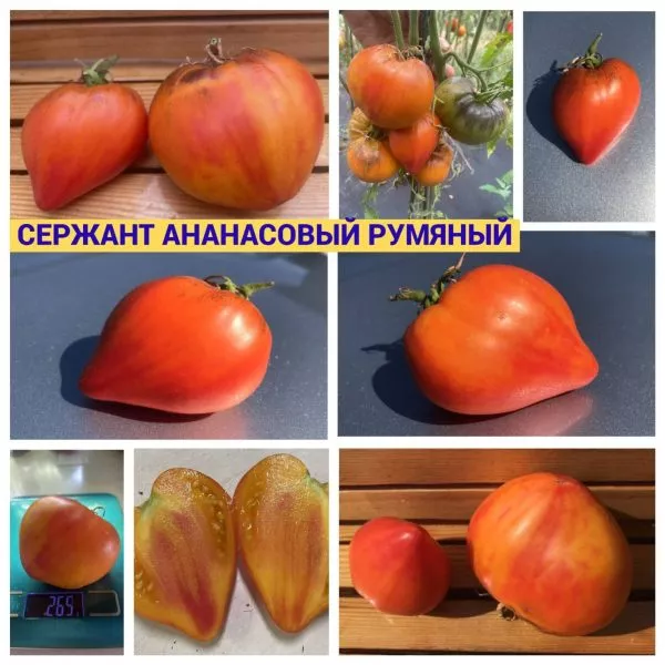 Название сорта носит описательный характер и напрямую отсылает к его уникальным чертам. Слово «Ананасный» указывает на сложную, многоцветную окраску зрелого плода, в которой сочетаются желтые, оранжевые и малиновые тона, что визуально напоминает тропический фрукт. Определение «Сержант» подчеркивает мощный, высокорослый и крепкий «стан» индетерминантного растения, которое требует надежной опоры и формирования. Эпитет «Румяный» дополняет описание, акцентируя внимание на ярком, румяном бочке плода, который становится особенно выраженным при полном созревании на солнце.