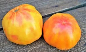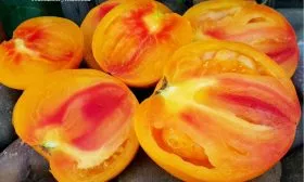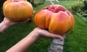 Все плоды, независимо от формы, относятся к категории биф-томатов (крупноплодных, мясистых). Их масса стабильно соответствует заявленным 500-600 граммам. Плоды многокамерные, с небольшим количеством семян. Мякоть очень плотная, сахаристая на изломе, что предопределяет его отличные качества для переработки на пасту и сок.