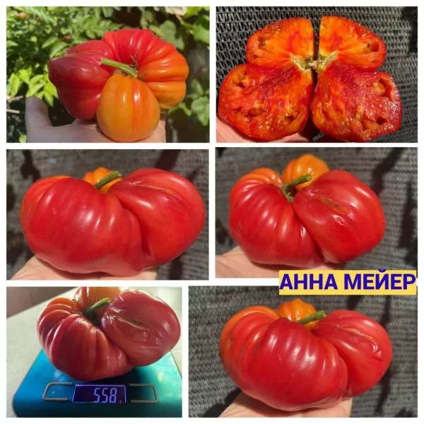 Главная отличительная черта «Анны Мейер» — выраженный полиморфизм (разнообразие формы) плодов. Это не случайное явление, а устойчивый сортовой признак. На одном растении одновременно могут формироваться классические плоскоокруглые и ярко выраженные сердцевидные томаты. Причем эта вариативность часто наблюдается в пределах одной кисти, что является редкой и ценной декоративной особенностью.
