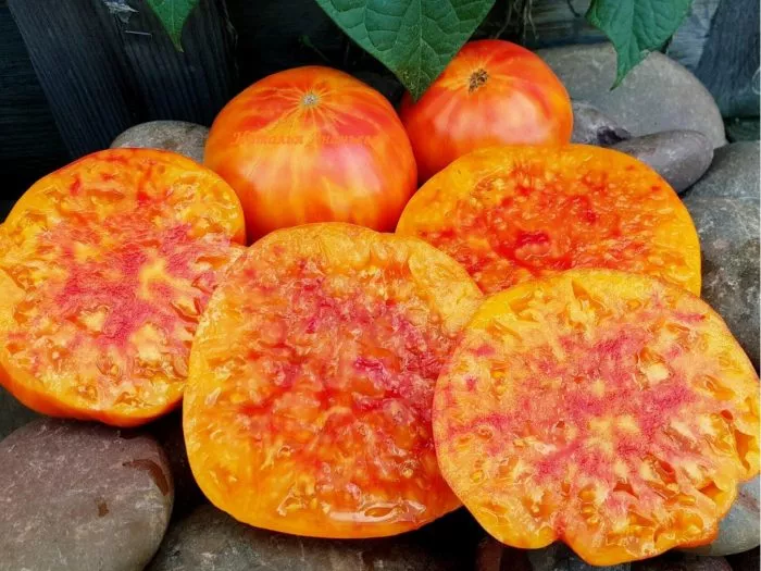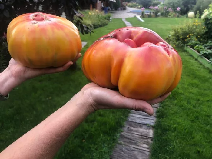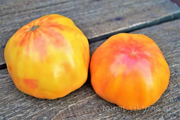 Все плоды, независимо от формы, относятся к категории биф-томатов (крупноплодных, мясистых). Их масса стабильно соответствует заявленным 500-600 граммам. Плоды многокамерные, с небольшим количеством семян. Мякоть очень плотная, сахаристая на изломе, что предопределяет его отличные качества для переработки на пасту и сок.
