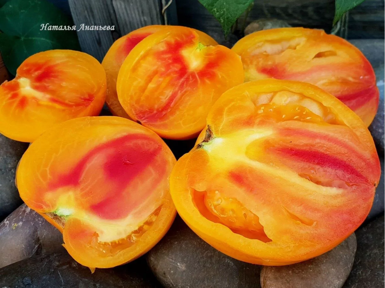 Описанная в характеристиках красно-желтая окраска проявляется в виде сложного градиента. Основной фон кожицы у зрелого плода — теплый желто-оранжевый или персиковый. К области плодоножки этот цвет плавно переходит в размытый розовый или красноватый румянец.