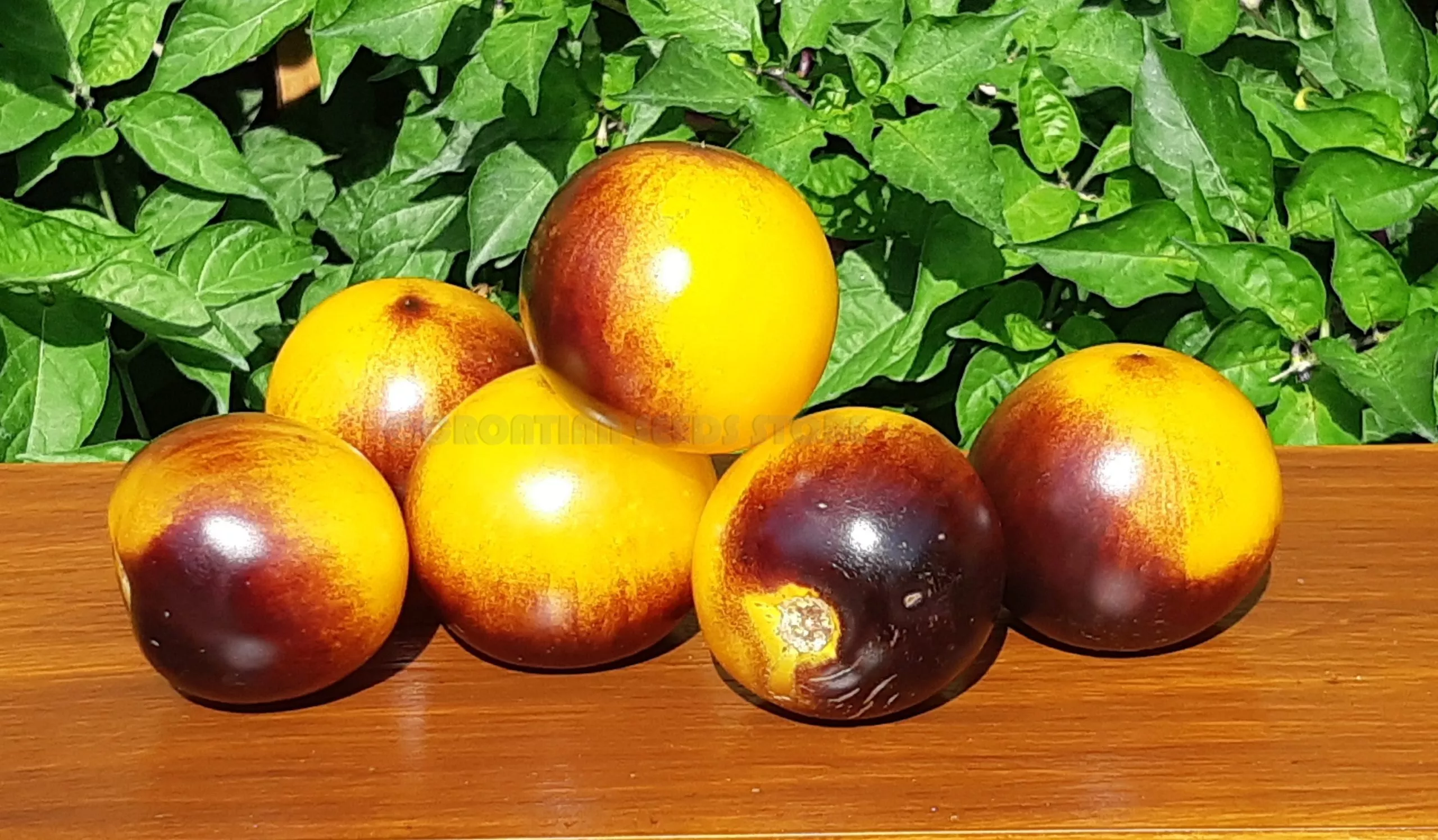 Главная отличительная черта этого сорта — уникальная двухцветная окраска зрелых плодов. Основной фон представляет собой яркий, насыщенный желтый цвет. На него, особенно на участках, получающих максимальное солнечное освещение, накладывается антоциановый налет оттенка индиго — от глубокого фиолетового до почти черного. Эта окраска не является равномерной, часто проявляясь в виде размытого румянца или отдельных штрихов, что делает каждый плод индивидуальным.