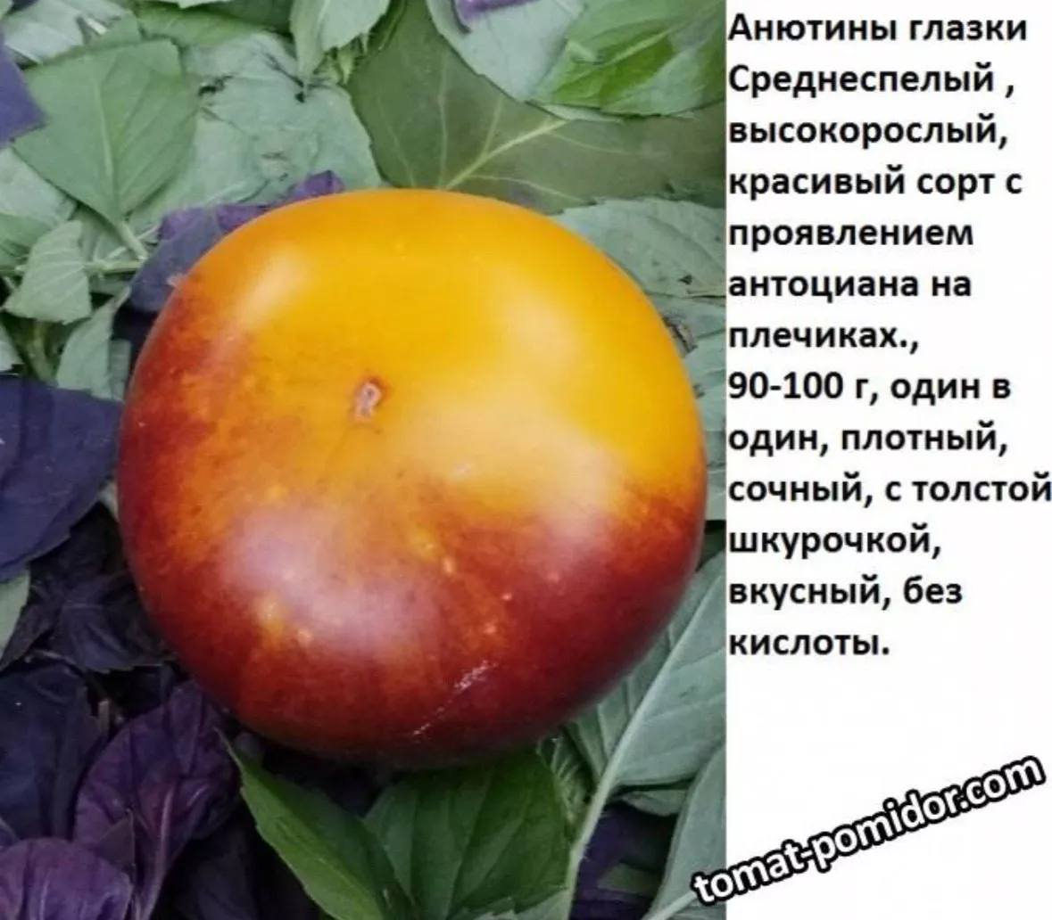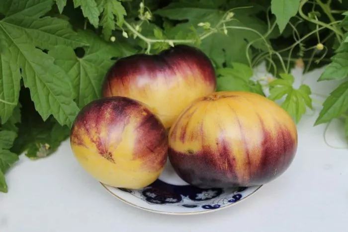 Сорт относится к группе биколорных (двухцветных) томатов с антоциановой пигментацией. Его характерная черта — контрастное сочетание желтого фона и индиго-синих плечиков или разводов. Такой окрас обусловлен наличием антоцианов — природных пигментов, которые также содержатся в баклажанах и чернике. Эти вещества не только придают кожице насыщенный цвет, но и могут влиять на биохимический состав мякоти, что коррелирует с указанным в характеристиках особым вкусом.