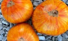 Плоды этого сорта — его главная отличительная черта. Их окраска является сложной и многосоставной. Основной фон в стадии полной биологической спелости — теплый желто-оранжевый. По всей поверхности плода проходят контрастные, насыщенно-красные продольные полосы.