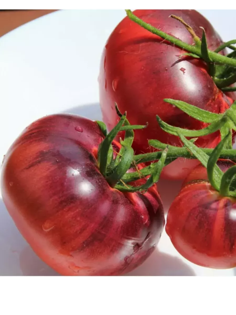 Плоды — ключевая отличительная черта сорта. Их форма классифицируется как плоскоокруглая с выраженной ребристостью, особенно заметной у плодоножки. Такая структура характерна для многих биф-томатов (крупноплодных мясистых сортов) и придает плодам узнаваемый, «старинный» вид.