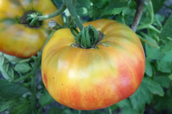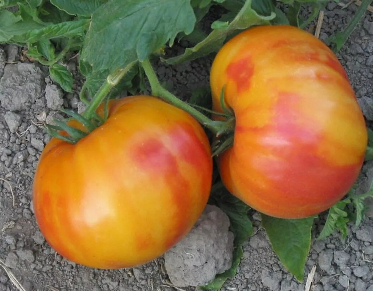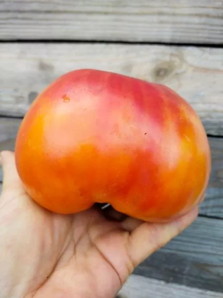 Плоды завязываются кистями. Из-за их крупного размера, достигающего 400-500 граммов, на одной кисти формируется ограниченное количество томатов. Плоды имеют характерную плоскоокруглую форму с хорошо заметной ребристостью у плодоножки. Ребра не глубокие, а скорее выраженные, что придает томату узнаваемый внешний вид.