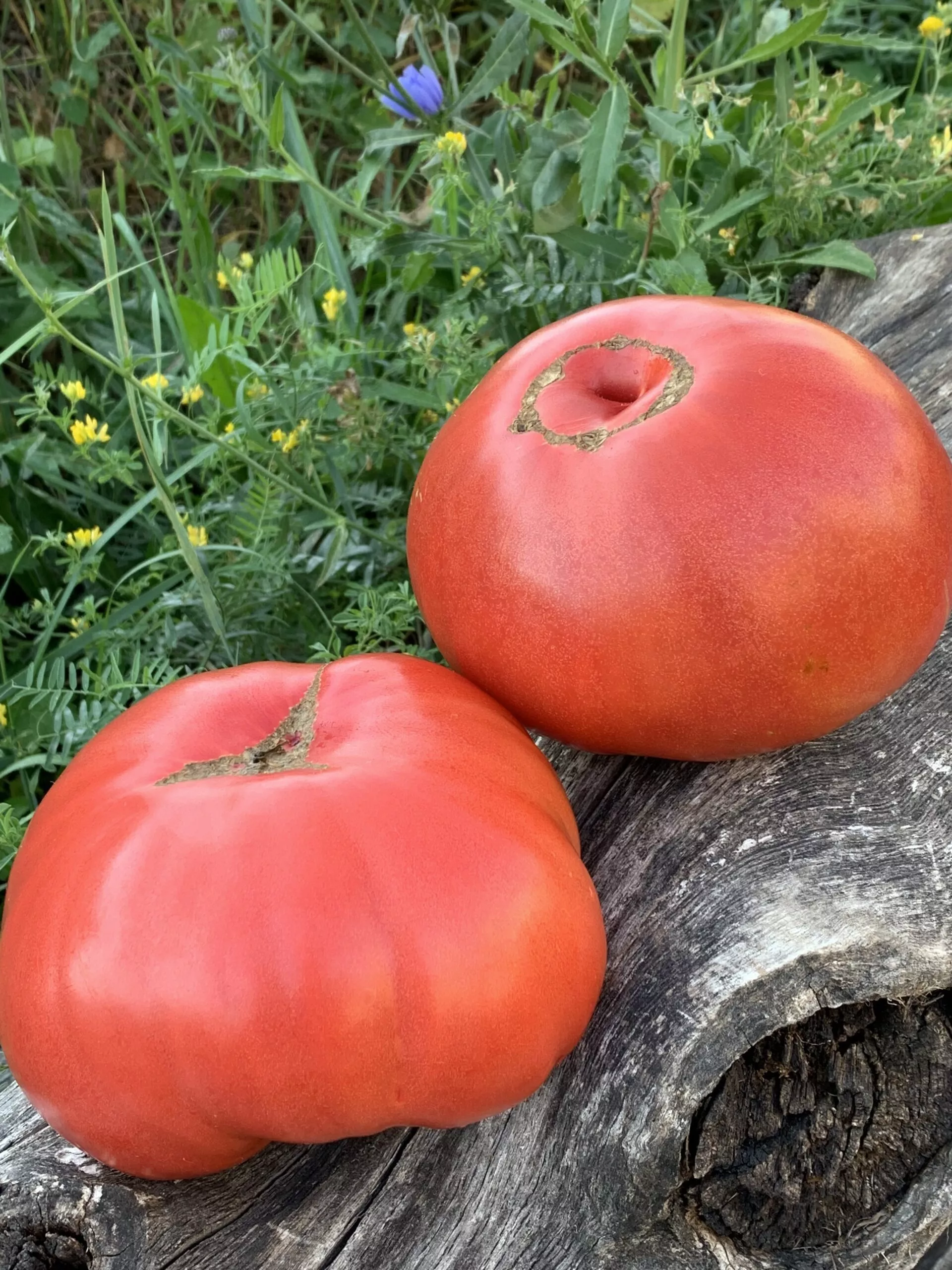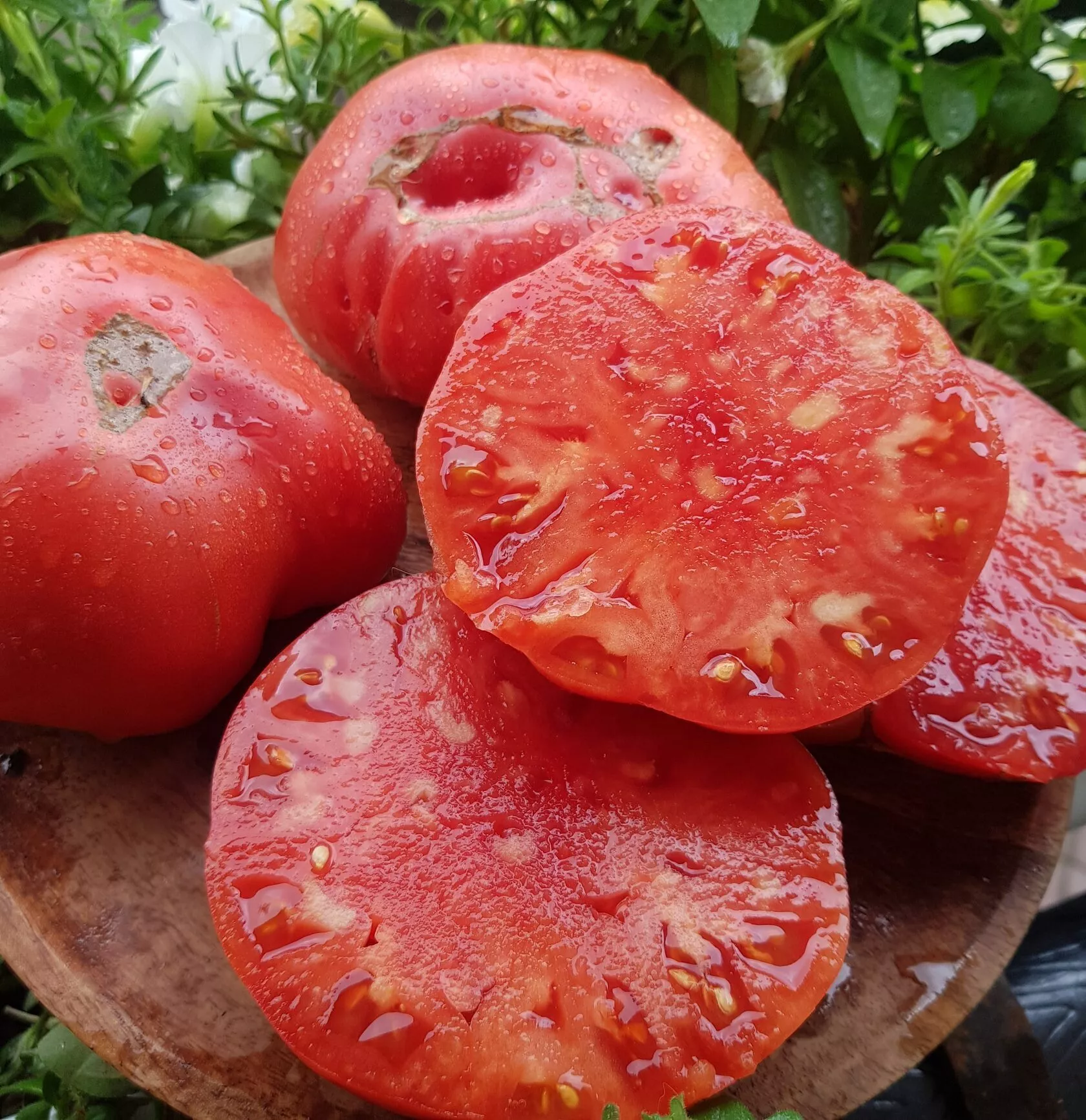 Внешний вид этого томата запоминается с первого взгляда, и главный акцент здесь, безусловно, на плодах. Они имеют классическую для биф-томатов плоскоокруглую форму, часто с выраженной ребристостью у плодоножки. В полной зрелости кожица и мякоть приобретают насыщенный малиново-красный оттенок, без зеленых пятен у плодоножки.