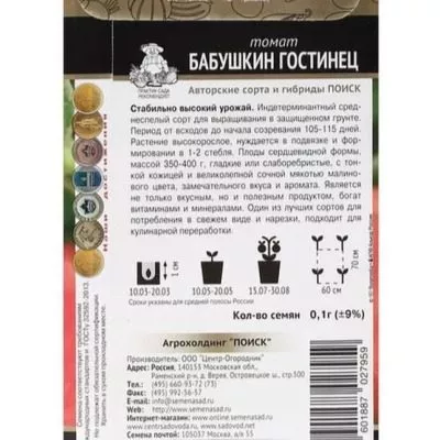 Официальным подтверждением селекционных качеств служит включение томата Бабушкин гостинец в Государственный реестр селекционных достижений Российской Федерации. Включение в реестр означает, что сорт прошел многолетние государственные испытания, в ходе которых были проверены и подтверждены все его заявленные характеристики: урожайность, сроки созревания, устойчивость к основным заболеваниям и адаптивность к рекомендованным регионам выращивания.