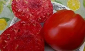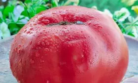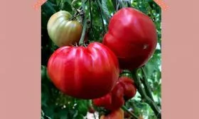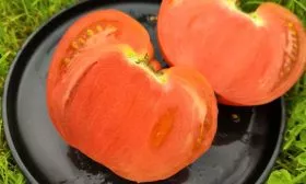 Плоды имеют характерную округло-сердцевидную форму, часто с выраженным «носиком». Полностью созревший томат приобретает насыщенный малиново-розовый цвет без зеленого пятна у плодоножки. Ключевая особенность сорта — значительный разброс в массе плодов на одном растении, напрямую зависящий от порядка кисти и агротехники.