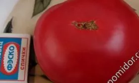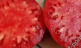 Окраска зрелого плода – равномерная, насыщенно-красная, без зеленого или желтого пятна у плодоножки. Мякоть исключительно плотная и мясистая, с высоким содержанием сухих веществ. На изломе она не сочная, а сахаристая, что видно невооруженным глазом. Число семенных камер небольшое, семян мало.