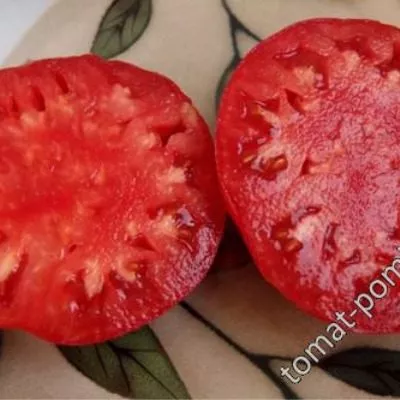 Окраска зрелого плода – равномерная, насыщенно-красная, без зеленого или желтого пятна у плодоножки. Мякоть исключительно плотная и мясистая, с высоким содержанием сухих веществ. На изломе она не сочная, а сахаристая, что видно невооруженным глазом. Число семенных камер небольшое, семян мало.