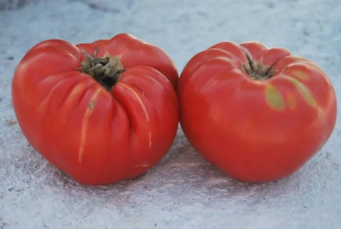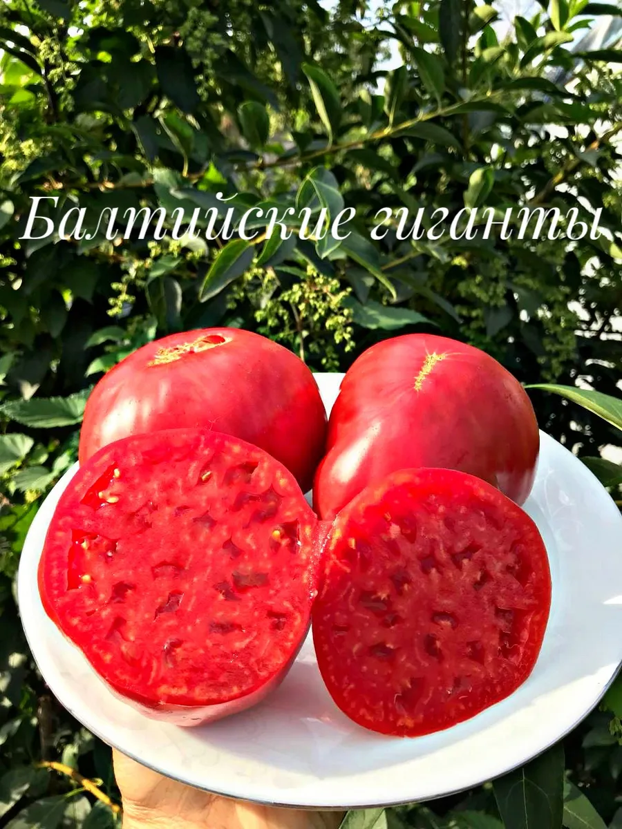 Плоды «Балтийских гигантов» имеют узнаваемую, характерную для многих биф-томатов (крупноплодных салатных томатов) внешность. Их форма плоско-округлая, с ярко выраженной, иногда сильно гофрированной ребристостью в области плодоножки. Эта ребристость — не брак, а визуальный маркер сложного многокамерного внутреннего строения.
