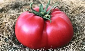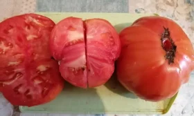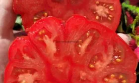 Мякоть очень плотная, сахаристая на изломе, с малым количеством семян и семенных камер. Такая структура, типичная для биф-томатов, и позволяет плодам набирать огромную массу. Однако размер — величина регулируемая. На него напрямую влияет агротехника и нормирование.