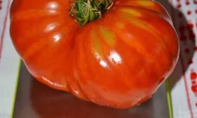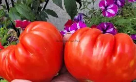 Главная отличительная черта — это, безусловно, плоды-гиганты. Их плоскоокруглая форма часто имеет выраженную ребристость в области плодоножки, что придает им характерный «бифштексный» вид. В состоянии полной спелости они окрашиваются в равномерный, насыщенный красный цвет без зеленого пятна у плодоножки.