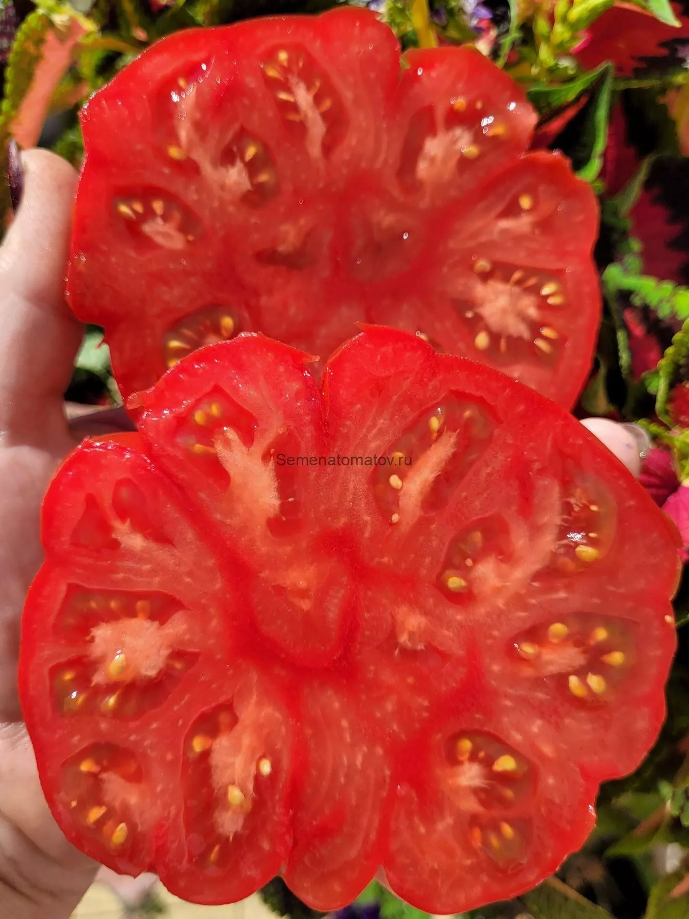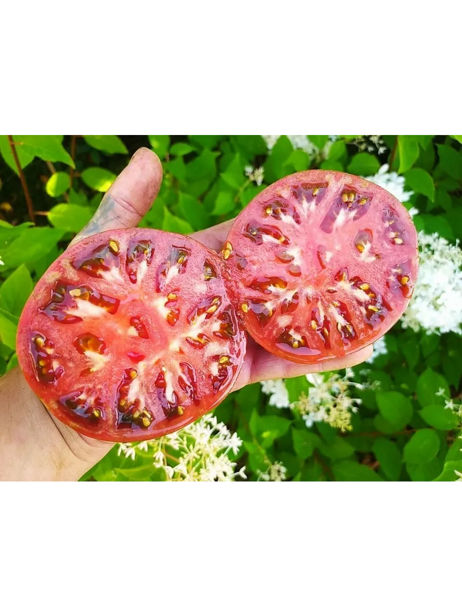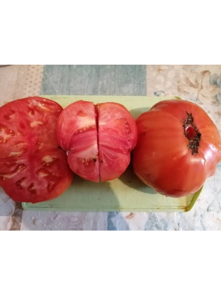 Мякоть очень плотная, сахаристая на изломе, с малым количеством семян и семенных камер. Такая структура, типичная для биф-томатов, и позволяет плодам набирать огромную массу. Однако размер — величина регулируемая. На него напрямую влияет агротехника и нормирование.