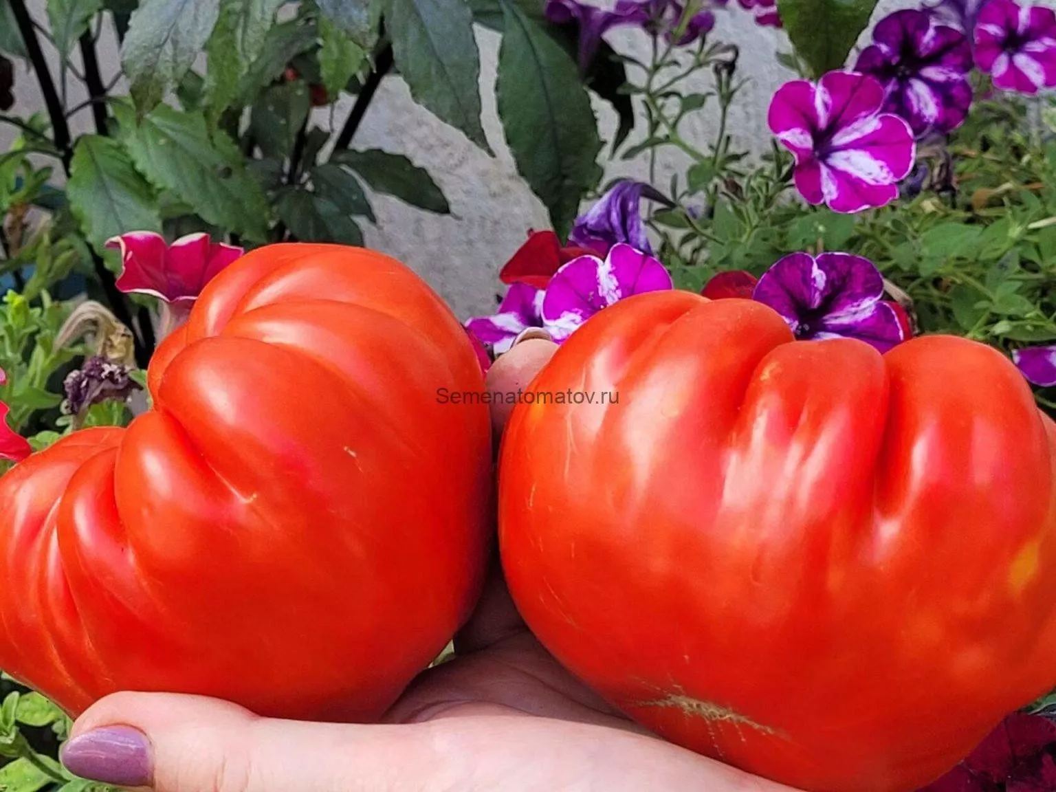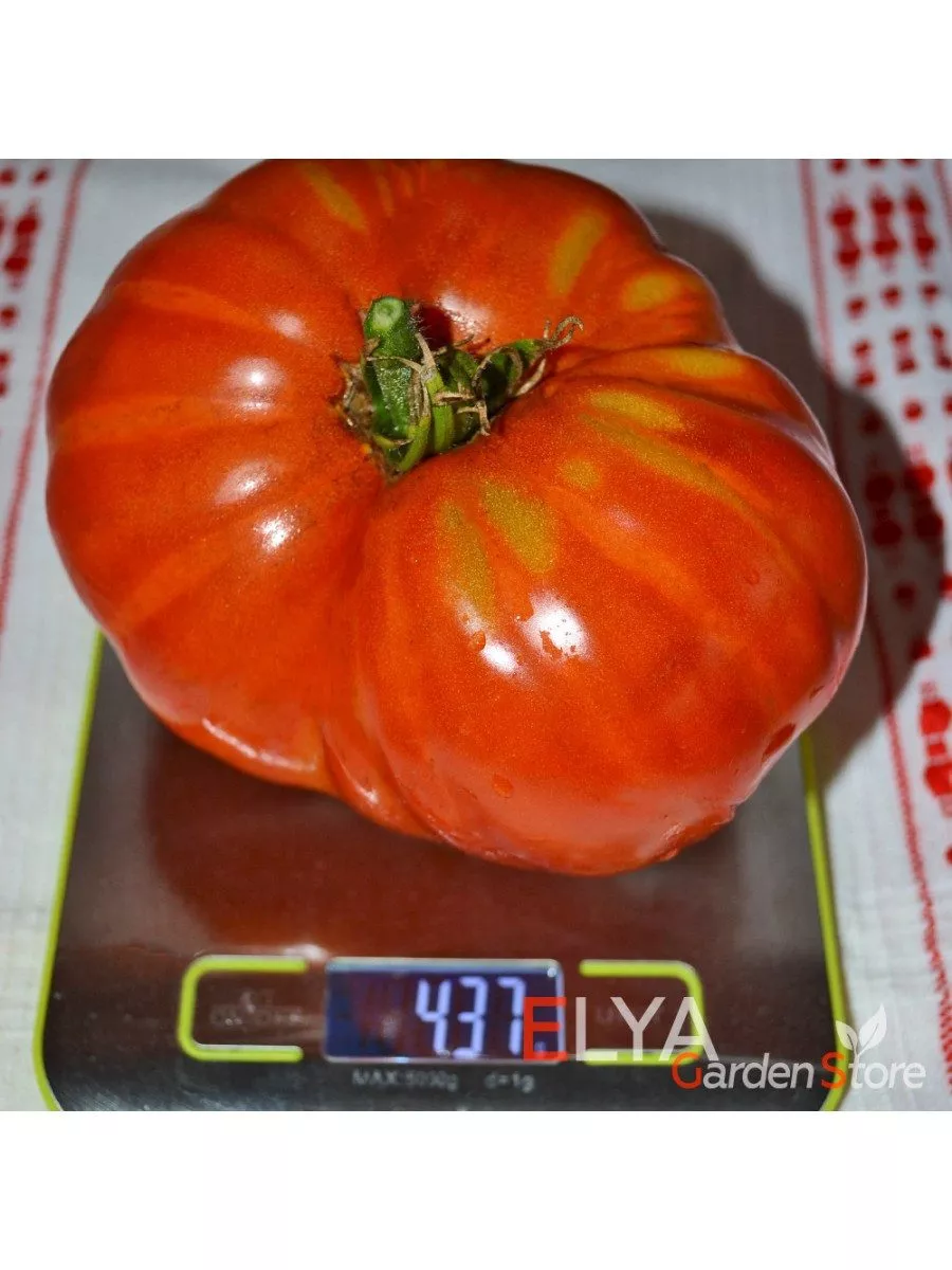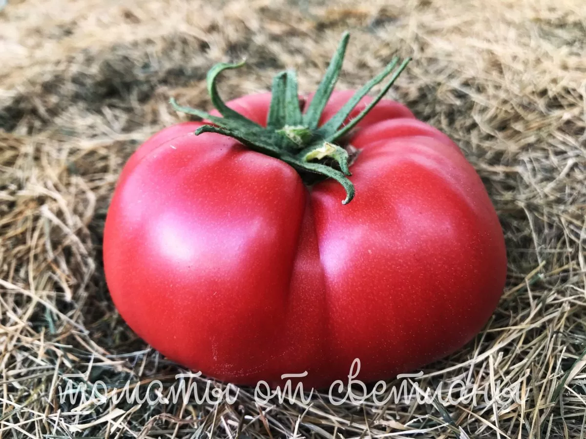 Главная отличительная черта — это, безусловно, плоды-гиганты. Их плоскоокруглая форма часто имеет выраженную ребристость в области плодоножки, что придает им характерный «бифштексный» вид. В состоянии полной спелости они окрашиваются в равномерный, насыщенный красный цвет без зеленого пятна у плодоножки.