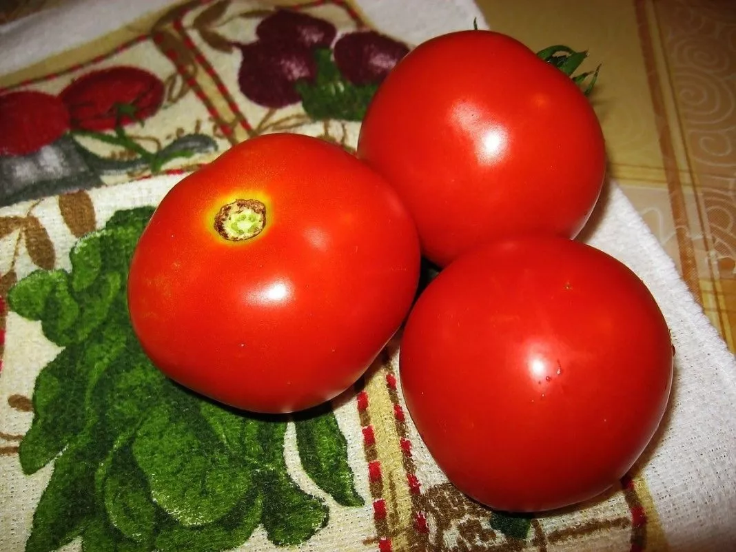 Плоды имеют классическую плоскоокруглую форму, часто с легкой ребристостью в области плодоножки. Одно из ключевых преимуществ — равномерная окраска. При полном созревании помидор приобретает насыщенный красный цвет без зеленого или желтоватого пятна у основания, что делает его внешне очень привлекательным.
