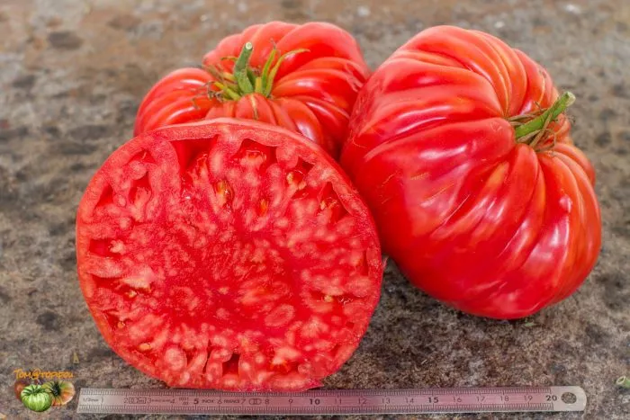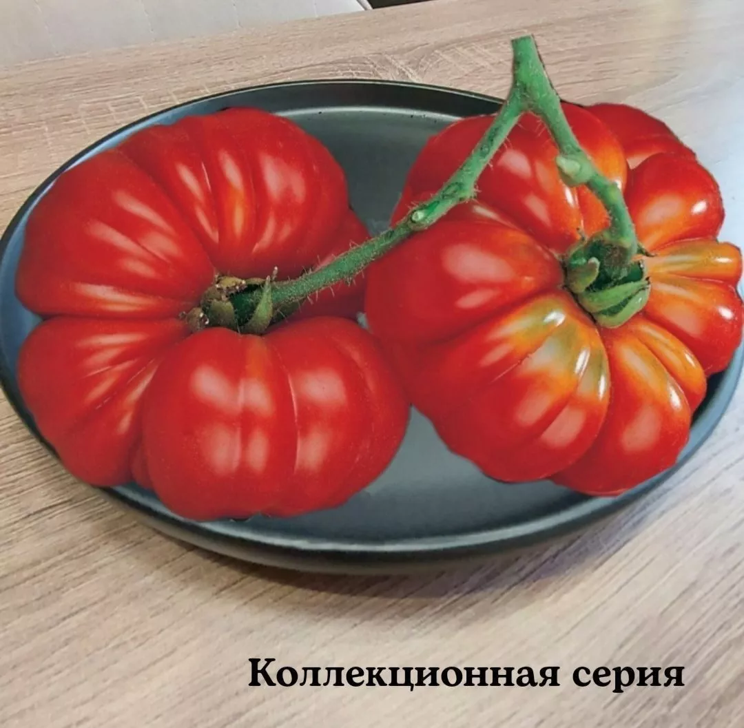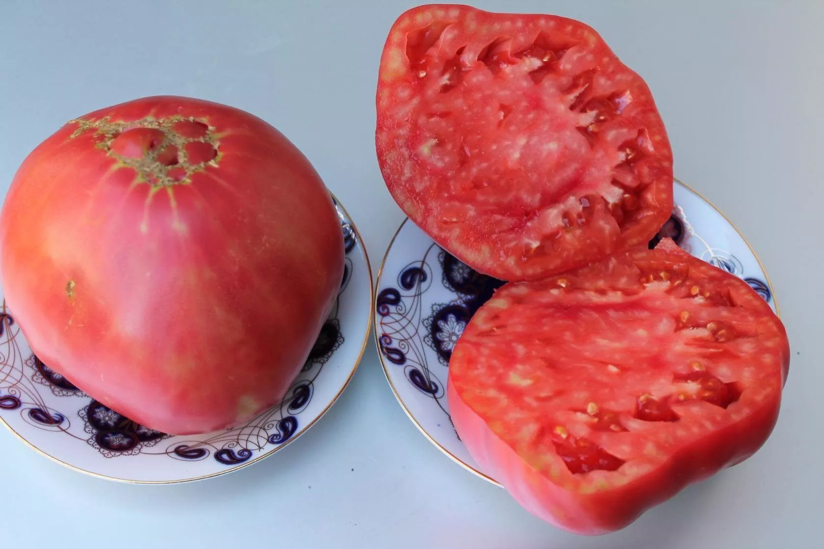 Форма плода — классическая плоскоокруглая, часто с заметной ребристостью в области плодоножки. В состоянии технической спелости томаты светло-зеленые, без темного пятна у основания. Полное созревание характеризуется насыщенным, равномерным розово-малиновым окрасом.