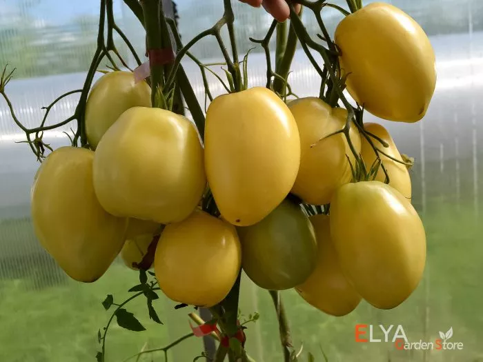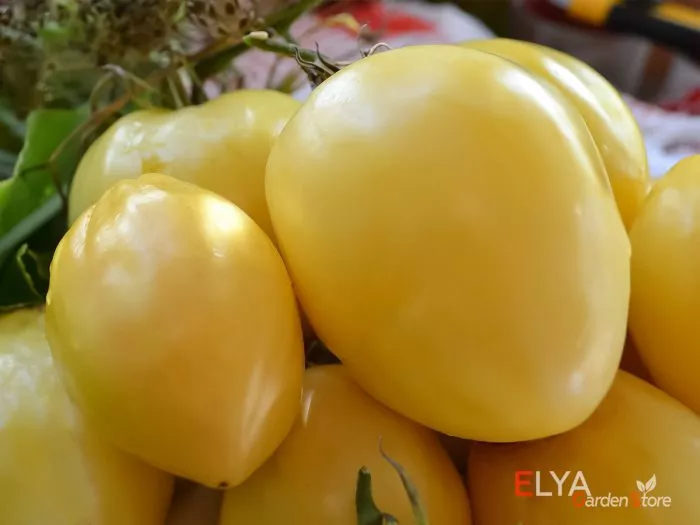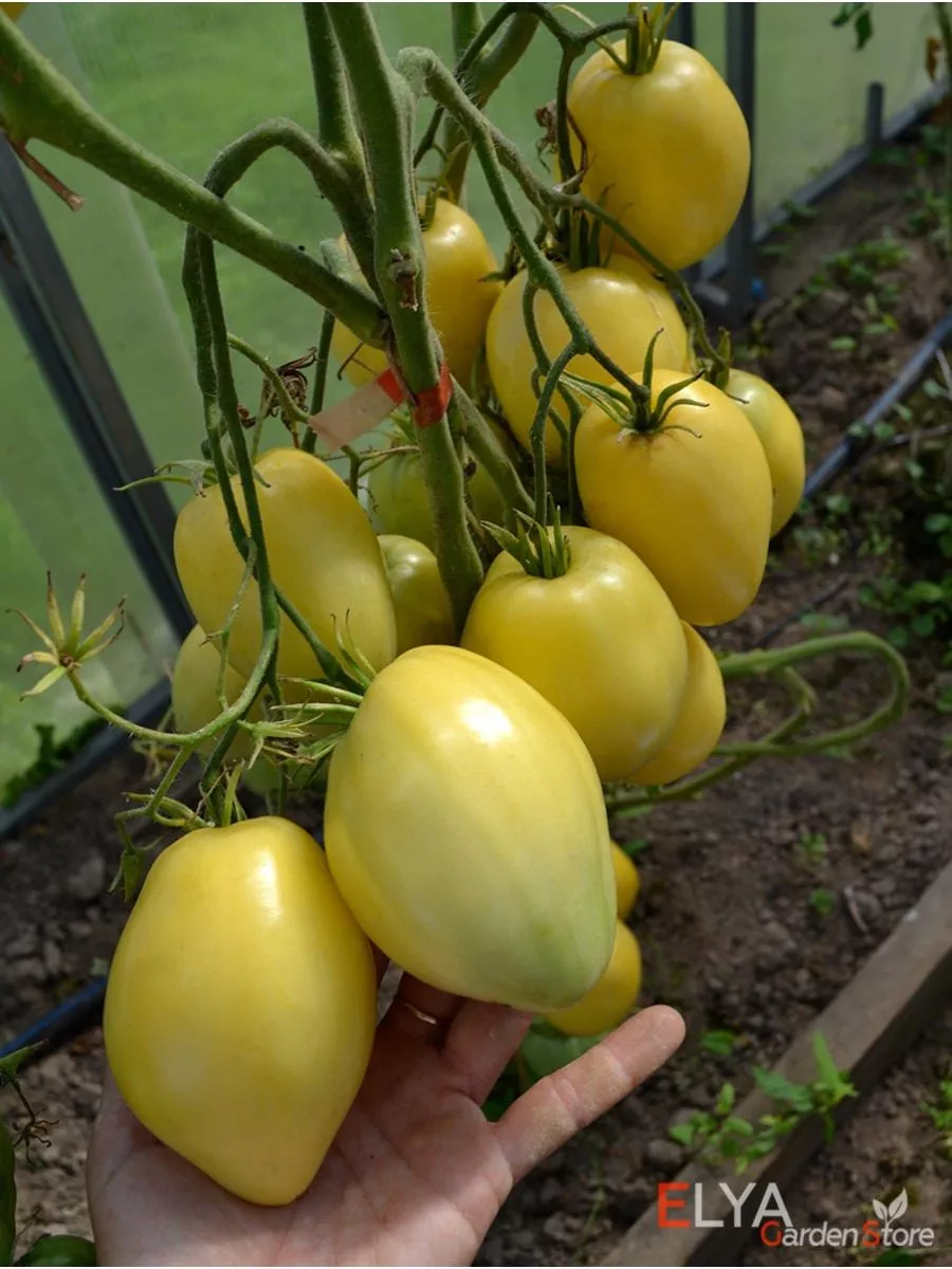 Форма плодов является их ключевой отличительной чертой – это классическое сердце, часто с четко выраженным заостренным кончиком («носиком»). Такая форма делает их непохожими на округлые или сливовидные томаты и сразу указывает на принадлежность к сортотипу «бычье сердце». Окраска меняется по мере созревания: изначально молочно-белая, она постепенно переходит в теплый кремово-желтый цвет, а при полном созревании на солнце может приобретать легкий абрикосовый румянец.