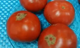Плоды — визитная карточка сорта. Их плоскоокруглая, часто слегка ребристая у плодоножки форма сразу указывает на крупноплодный тип. В состоянии биологической спелости помидоры приобретают насыщенный красный цвет.