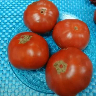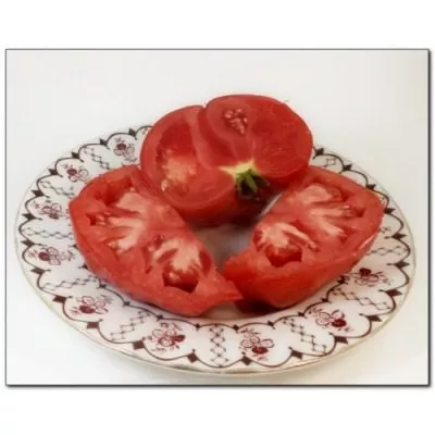 Плоды — визитная карточка сорта. Их плоскоокруглая, часто слегка ребристая у плодоножки форма сразу указывает на крупноплодный тип. В состоянии биологической спелости помидоры приобретают насыщенный красный цвет.