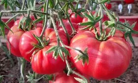 | Масса плода | 350-425 г | Кисти с такими тяжелыми плодами нуждаются в дополнительной поддержке (подвязке), чтобы не обломились. Нормирование количества завязей в кисти способствует получению выровненных по размеру томатов. |