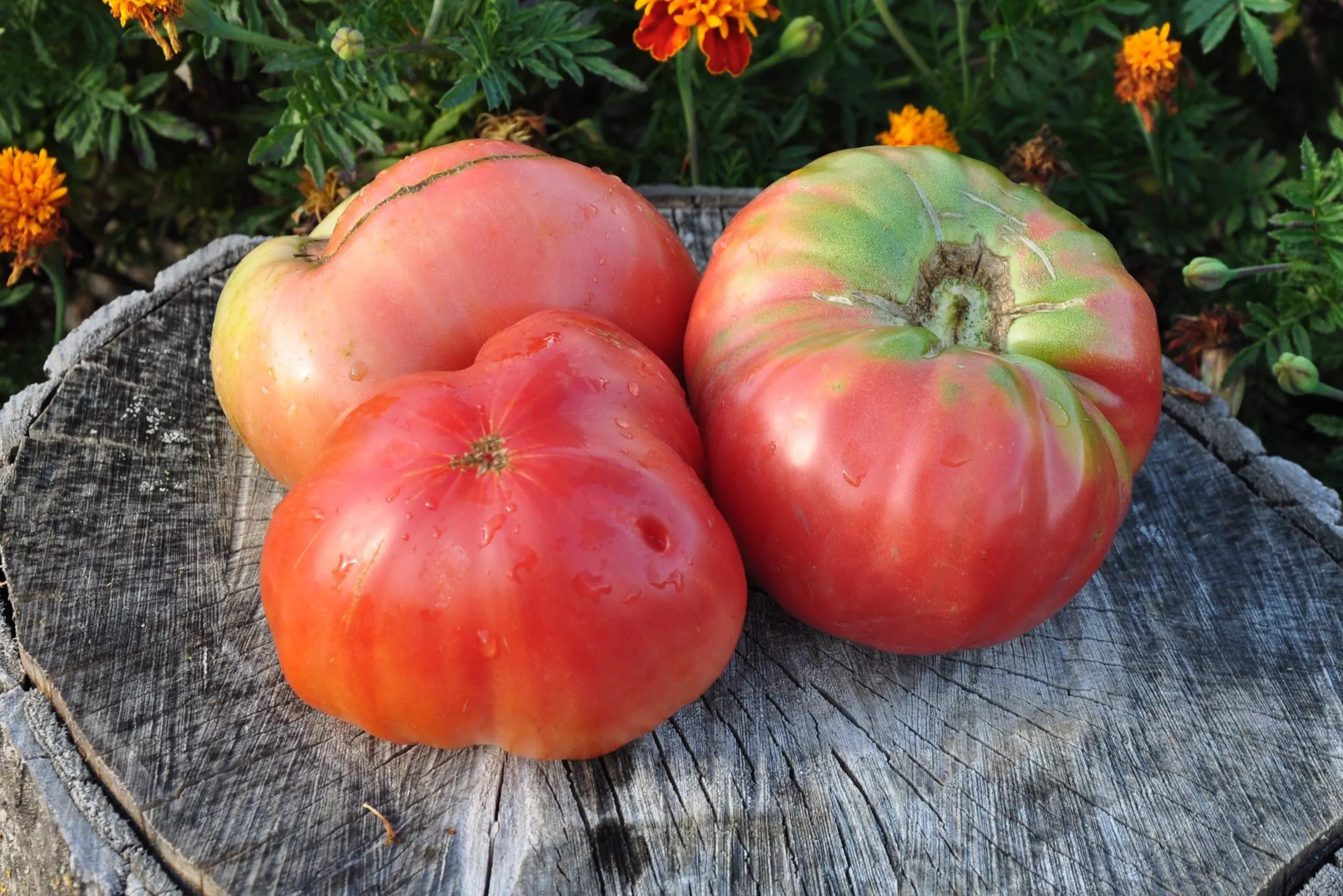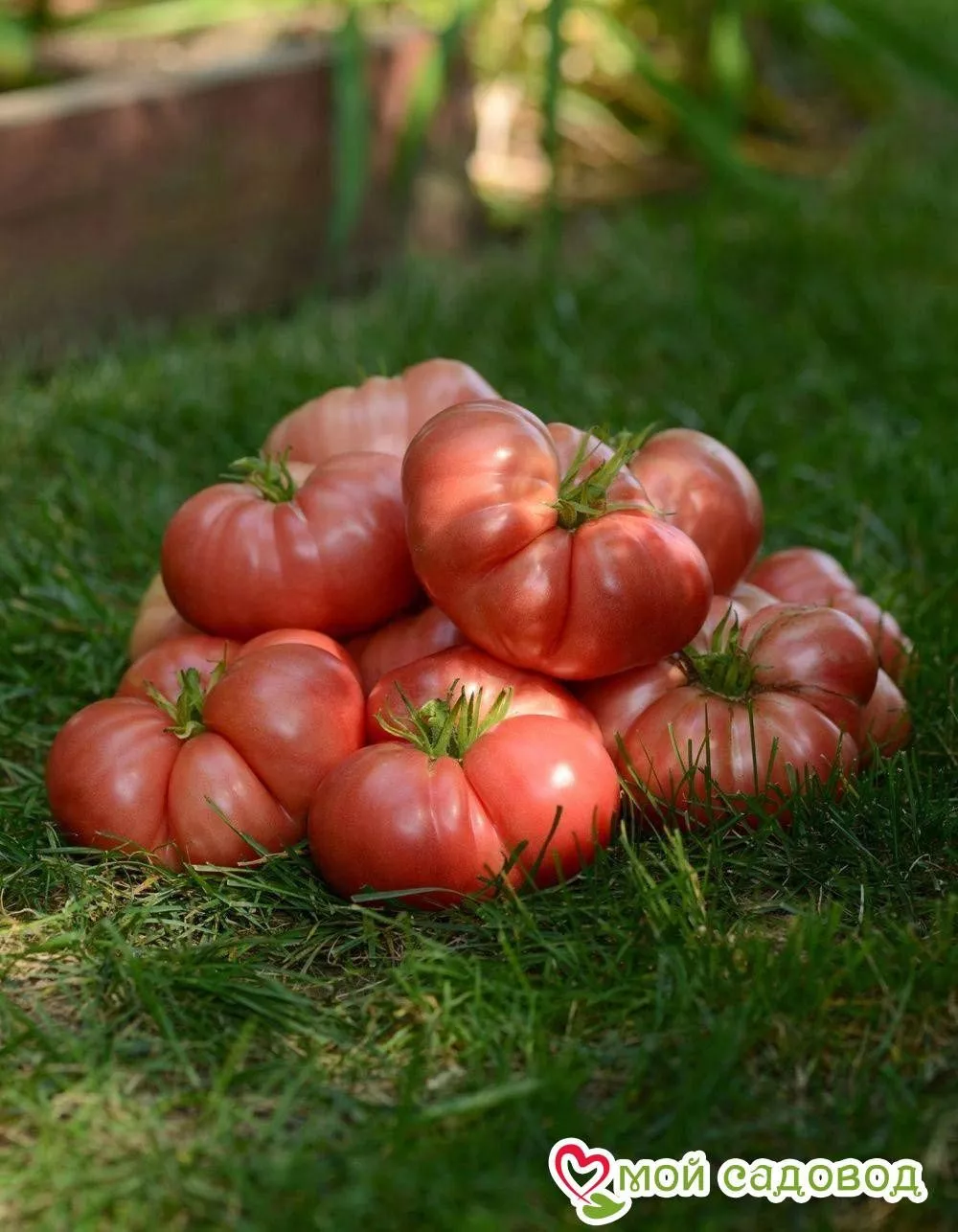 Плоды являются главной отличительной чертой этого гибрида. Их плоскоокруглая форма с выраженным делением на крупные доли и массивными, ребристыми плечиками делает их узнаваемыми. В стадии полной зрелости томаты приобретают равномерный розовый цвет без зеленого пятна у плодоножки.