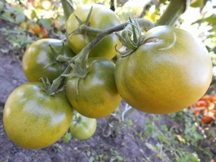 Динамика окраски — ключевой отличительный признак. Незрелый томат имеет насыщенный зеленый цвет с темным пятном у основания. По мере созревания это пятно исчезает, а основной фон меняется на сложный янтарный оттенок. Окончательно созревший плод приобретает теплый желто-медовый цвет, при этом плечики (область вокруг плодоножки) часто остаются изумрудно-зелеными.