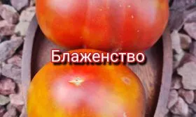 Внешний вид плодов «Блаженства» является его визитной карточкой. Согласно характеристикам, это пёстрые плоды с антоциановым отливом. На практике это выглядит как сложный многослойный рисунок. Основной фон зрелого томата — насыщенный малиново-розовый. На нем располагаются размытые полосы и пятна оттенков от желтого до зеленоватого.