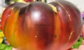 Форма плодов плоскоокруглая, часто с выраженной ребристостью у плодоножки, особенно у гигантов массой около 500 граммов. Мякоть исключительно мясистая, сахаристая, с малым количеством семян и семенных камер. При разрезе видна равномерная малиновая окраска без белых прожилок и зеленого пятна у плодоножки.