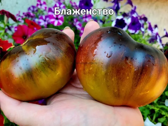 Внешний вид плодов «Блаженства» является его визитной карточкой. Согласно характеристикам, это пёстрые плоды с антоциановым отливом. На практике это выглядит как сложный многослойный рисунок. Основной фон зрелого томата — насыщенный малиново-розовый. На нем располагаются размытые полосы и пятна оттенков от желтого до зеленоватого.