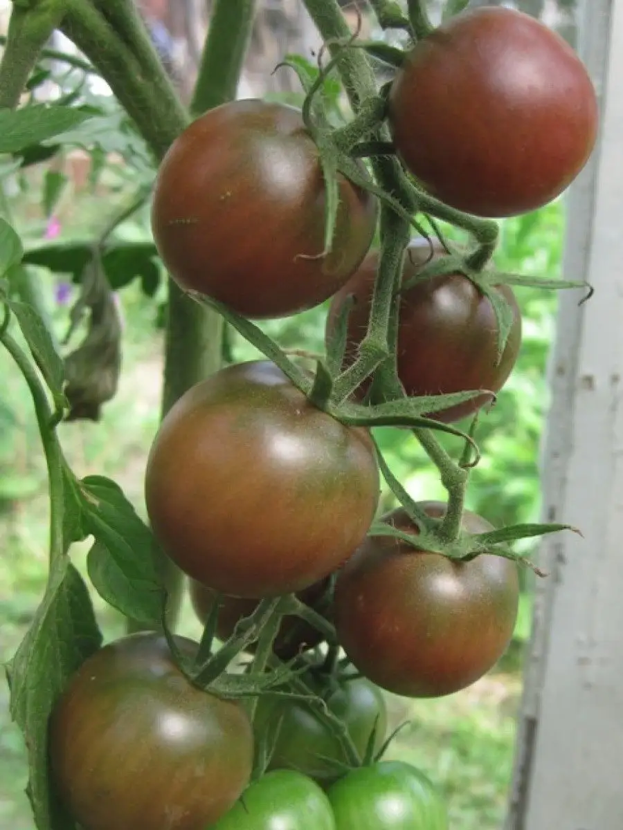 Индетерминантный высокорослый куст с длинными кистями, усыпанными многочисленными темными «ягодами», обладает высокой декоративностью. Его часто используют для вертикального озеленения в теплицах или высаживают на видном месте в открытом грунте, где он становится центром внимания.