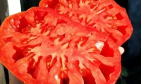 Структура плода способствует такому восприятию: внутри очень мало семенных камер и свободной жидкости. Основной объем занимает именно однородная, сочная мякоть, что характерно для биф-томатов. Благодаря этому сок из плодов получается не водянистым, а густым, похожим на свежевыжатый нектар.