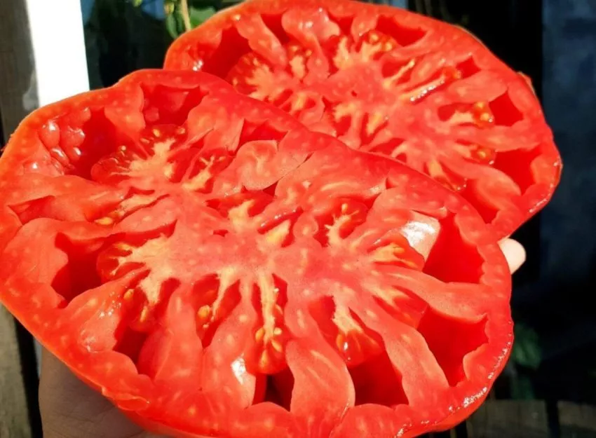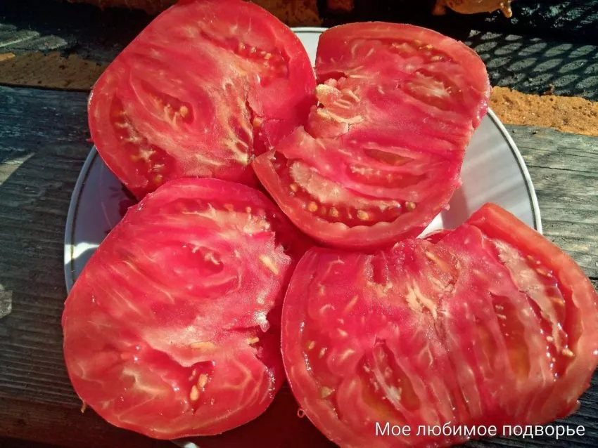 Структура плода способствует такому восприятию: внутри очень мало семенных камер и свободной жидкости. Основной объем занимает именно однородная, сочная мякоть, что характерно для биф-томатов. Благодаря этому сок из плодов получается не водянистым, а густым, похожим на свежевыжатый нектар.