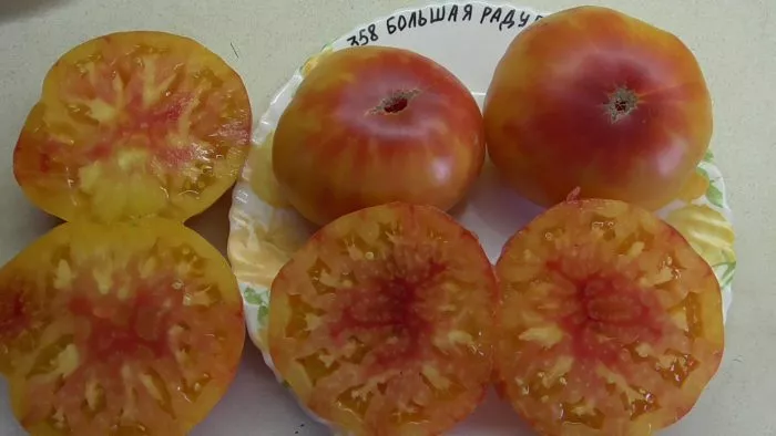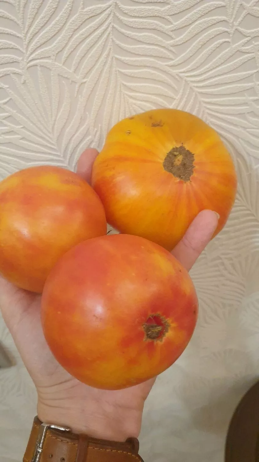 Главная особенность, давшая сорту название, — уникальная окраска плодов. Это не просто двухцветный помидор, а настоящая игра цвета, зависящая от условий выращивания. На красном фоне кожицы проступают яркие желтые разводы и полосы. Интенсивность красного цвета напрямую коррелирует с количеством полученного солнечного света: чем больше солнечных дней, тем насыщеннее и обширнее будет красный фон, а желтые полосы станут контрастнее. В пасмурное лето, в условиях загущенных посадок или при недостатке света в теплице плоды могут демонстрировать преобладание желтых и оранжевых тонов.
