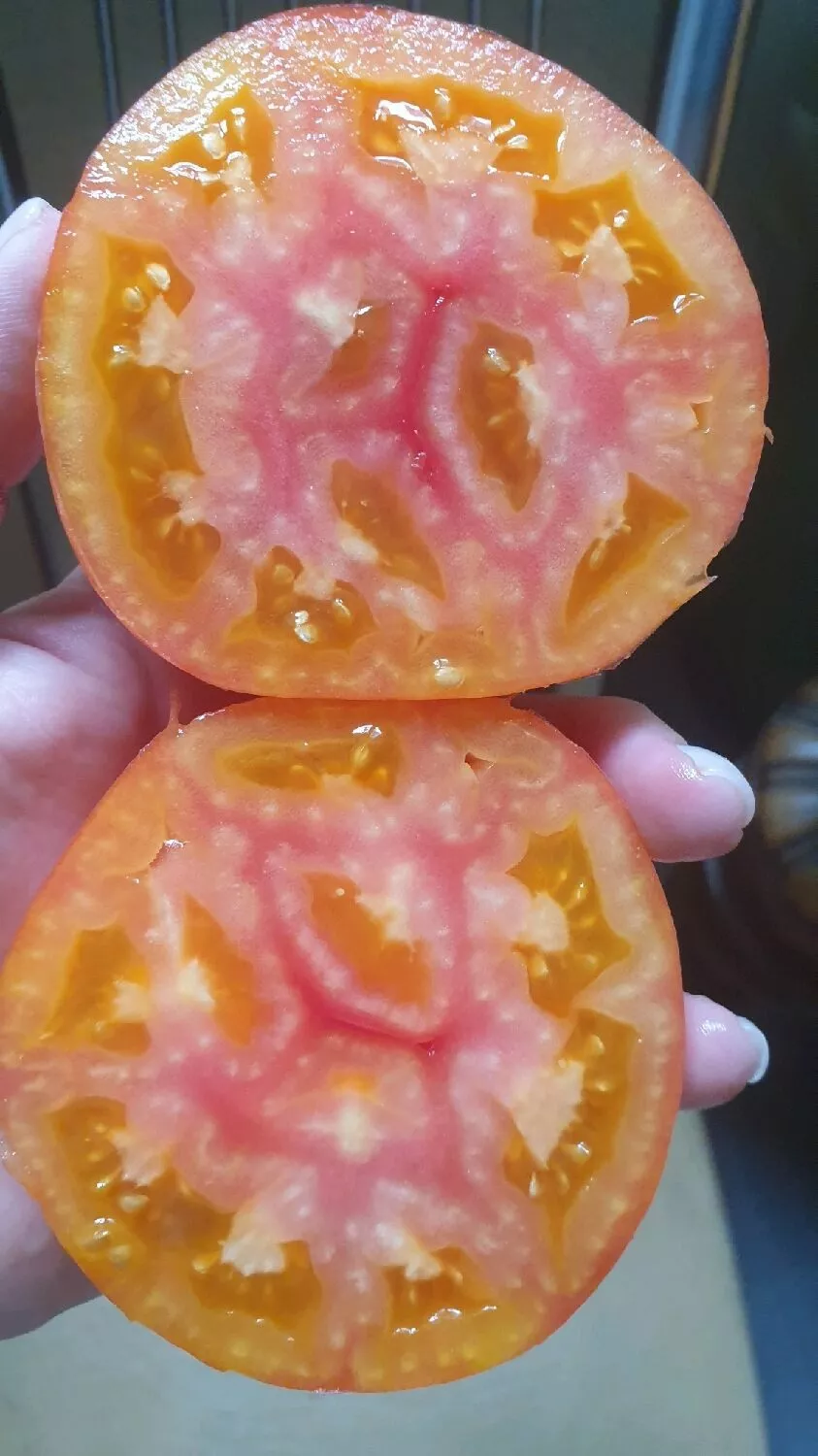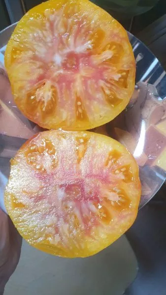 Мякоть обладает высокой плотностью и мясистостью, характерной для сортов, идущих на переработку. Внутри плод разделен на многокамерные сегменты с относительно небольшим количеством семян. Главная особенность — динамичная, нестабильная окраска. Цвет зрелого плода описывается как красный фон с желтыми разводами, но путь к этому результату длительный.
