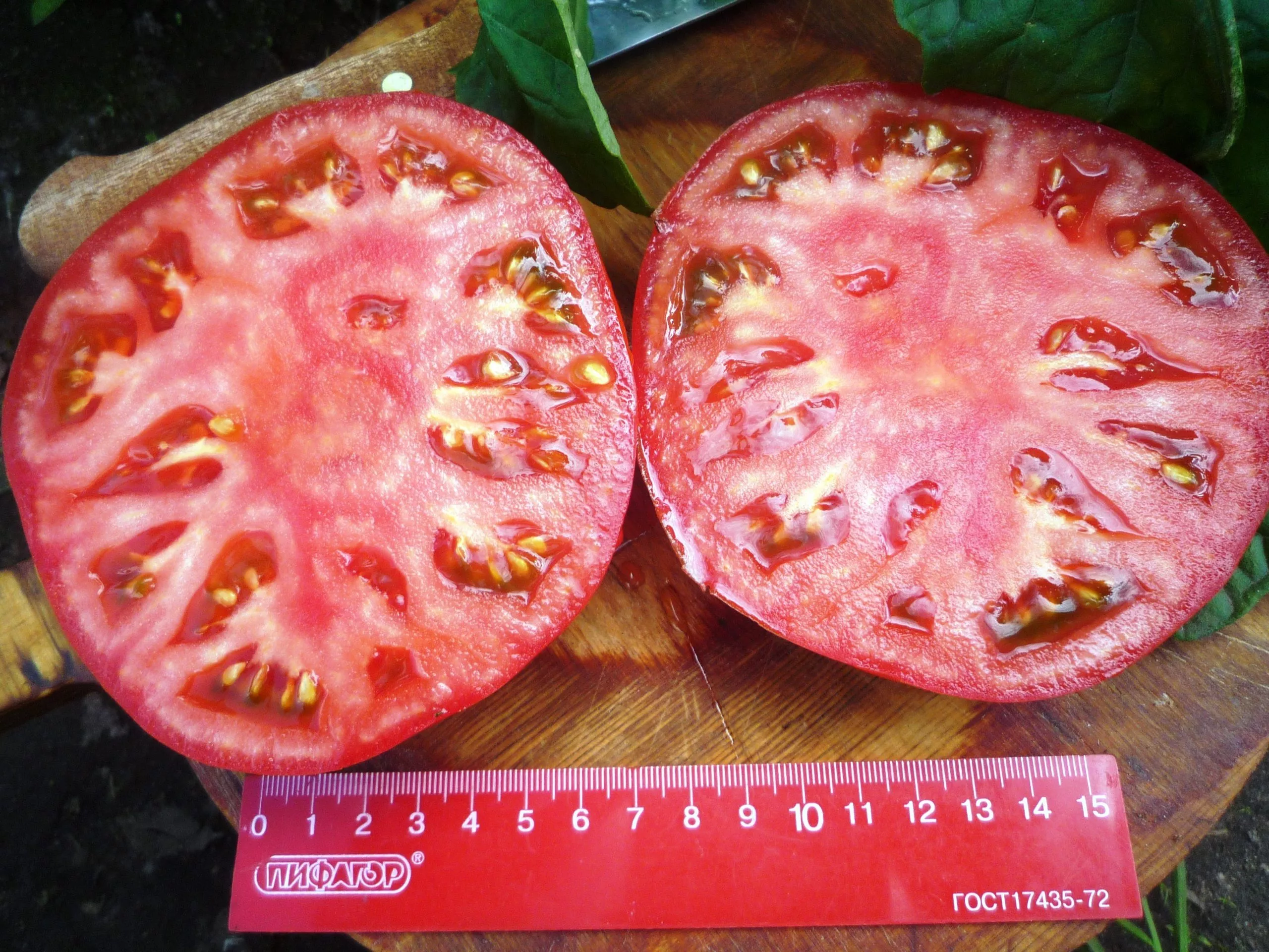 Плоды имеют классическую плоскоокруглую форму, типичную для многих крупноплодных биф-томатов. Часто у плодоножки наблюдается выраженная ребристость. В состоянии технической спелости окраска меняется на равномерный ярко-алый, красный цвет без зеленого пятна у основания.