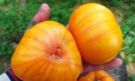 Масса плода часто достигает 400-500 граммов, а первые, самые нижние томаты могут быть и крупнее. Мякоть очень мясистая, многокамерная, с небольшим количеством семян. Цвет мякоти — оранжевый, иногда с розоватым или коралловым оттенком. Кожица тонкая, но плотная, что уберегает гигантские плоды от растрескивания.
