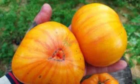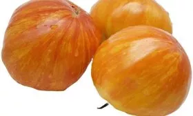 Главная отличительная черта сорта — это сочетание двух выдающихся качеств: очень крупных плодов и их декоративной окраски. Плоскоокруглые помидоры массой до 500 граммов в зрелом состоянии приобретают оранжевый фон, украшенный контрастными желтыми полосами. Такая характеристика напрямую определяет его кулинарное назначение.
