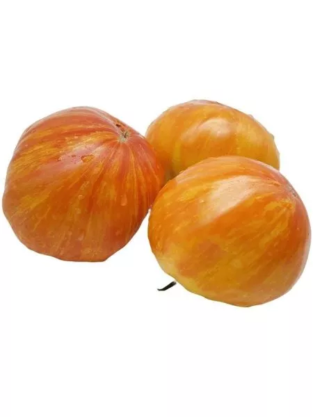 Главная отличительная черта сорта — это сочетание двух выдающихся качеств: очень крупных плодов и их декоративной окраски. Плоскоокруглые помидоры массой до 500 граммов в зрелом состоянии приобретают оранжевый фон, украшенный контрастными желтыми полосами. Такая характеристика напрямую определяет его кулинарное назначение.