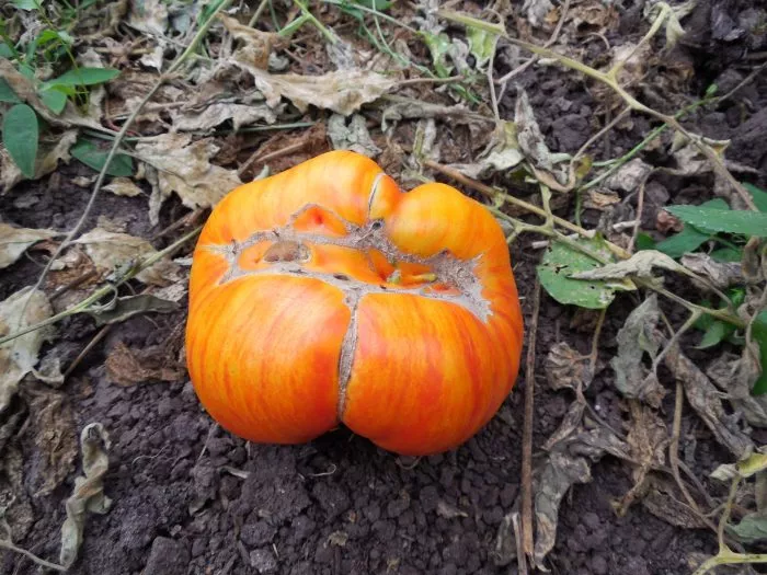 Именно плоды — визитная карточка этого сорта. Они полностью оправдывают свое название. Плоды плоскоокруглой формы, часто ребристые у плодоножки, что характерно для крупноплодных сортов. В стадии полной зрелости основной цвет кожицы — насыщенный оранжевый, по которому проходят четкие, контрастные желтые полосы. Окраска может быть неравномерной, что добавляет плодам «диковинный» вид.