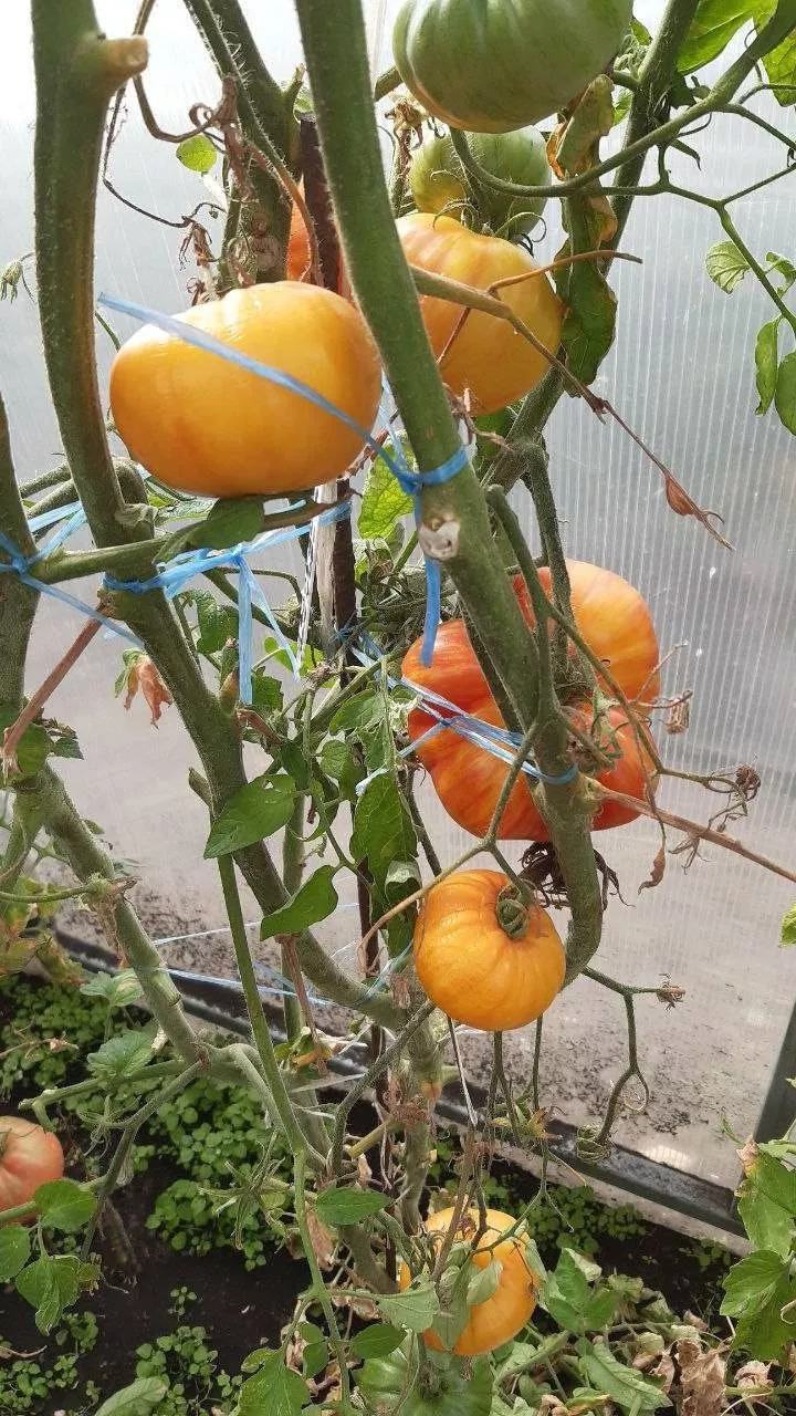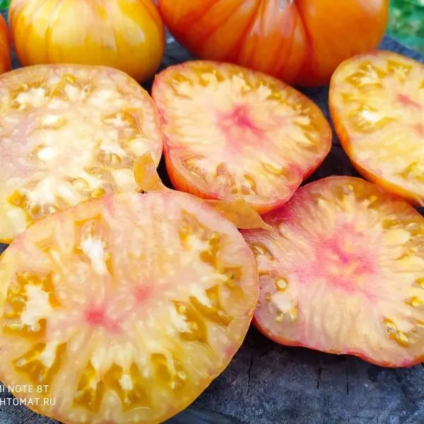 Масса плода часто достигает 400-500 граммов, а первые, самые нижние томаты могут быть и крупнее. Мякоть очень мясистая, многокамерная, с небольшим количеством семян. Цвет мякоти — оранжевый, иногда с розоватым или коралловым оттенком. Кожица тонкая, но плотная, что уберегает гигантские плоды от растрескивания.
